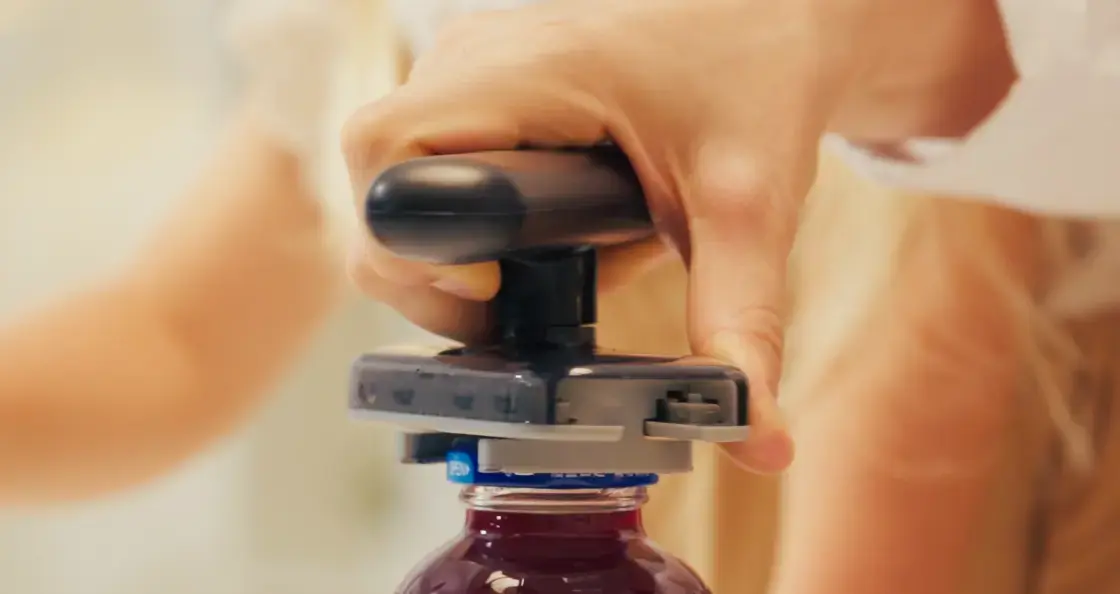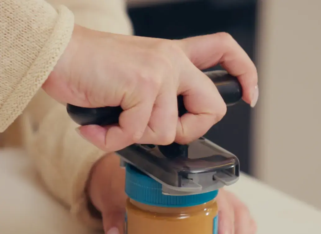 This sturdy, adjustable bottle and jar opener is simple, hard plastic, with no batteries, and designed for anyone — But especially for people who have hand and wrist pain.